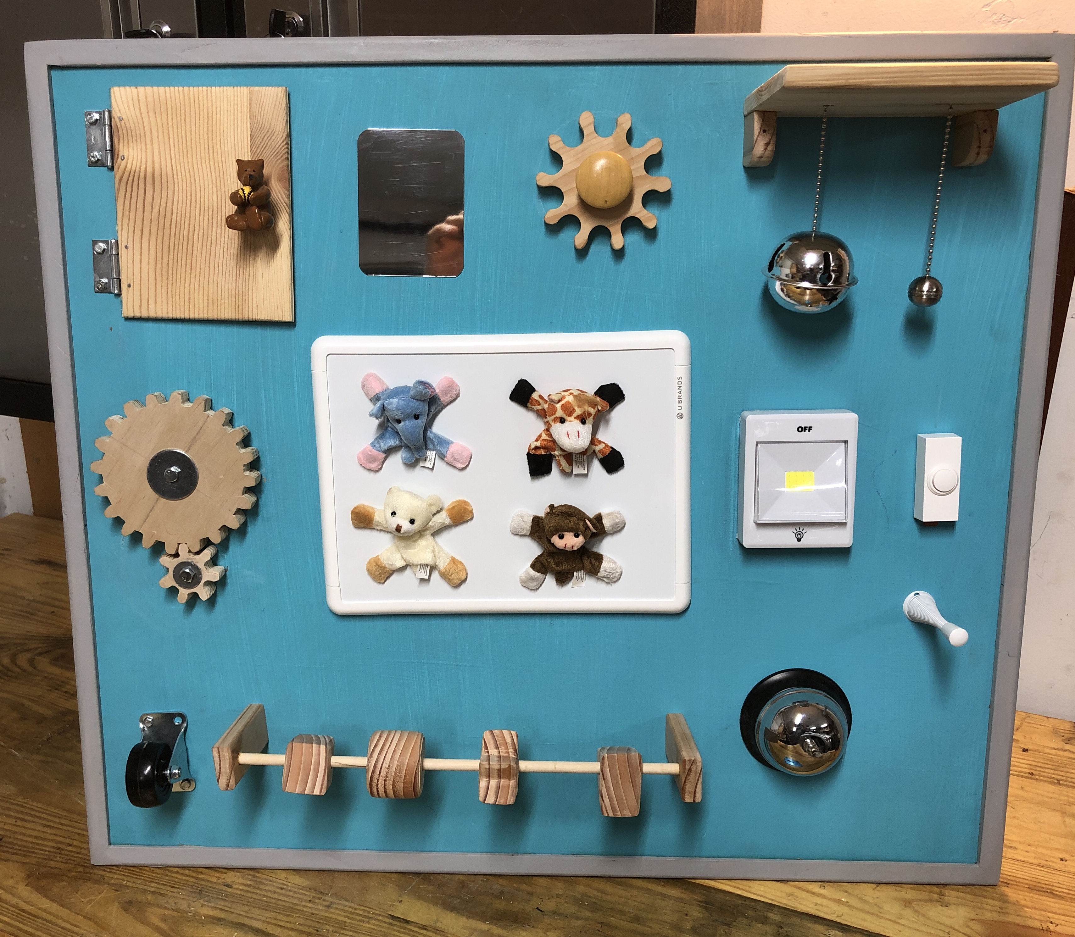 Of course, being that it was wood, I would need to sand it really good to prevent any splinters for Noah. I worked with all party’s involved to come up with the best solution. Being that Noah’s mother had several busy boards already, I wanted to make this unique to the other busy boards. The project was very fun and tested my creativity. Seeing Noah enjoy, and play with it after the party was very rewarding for me.